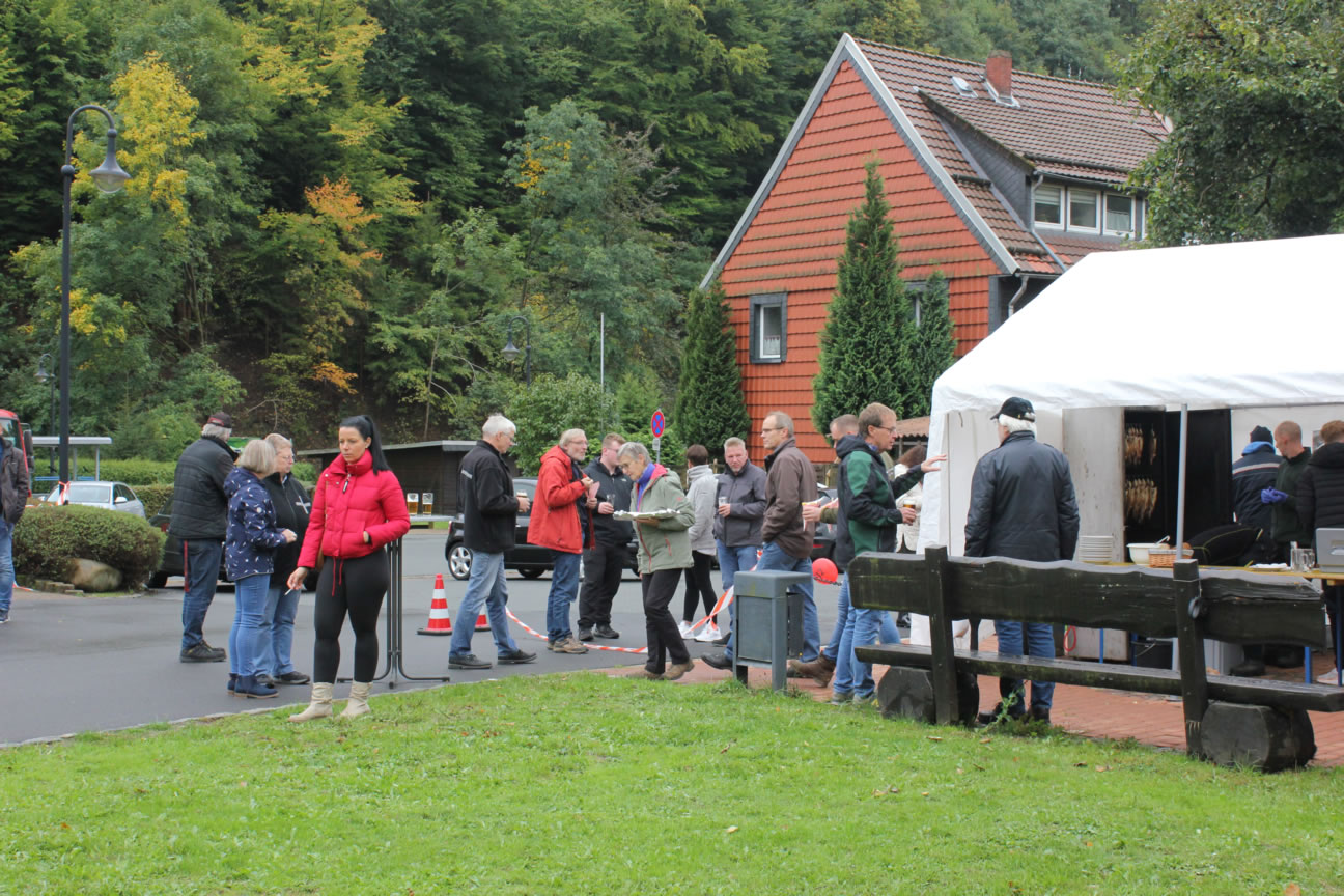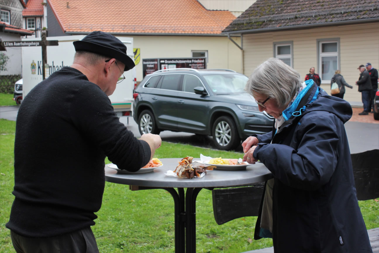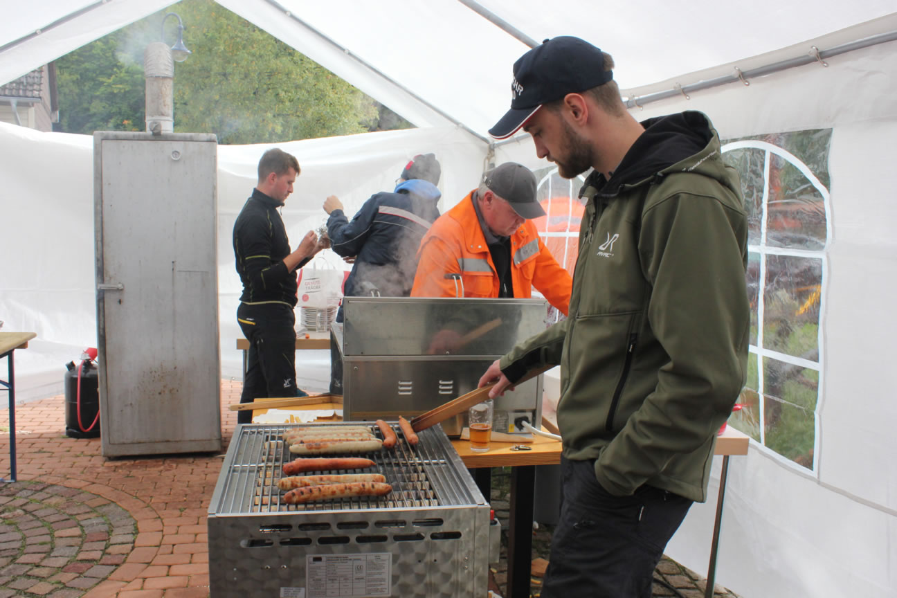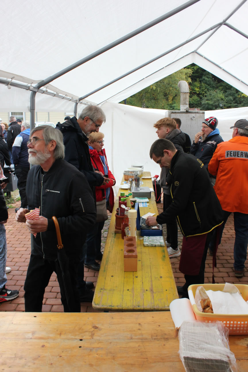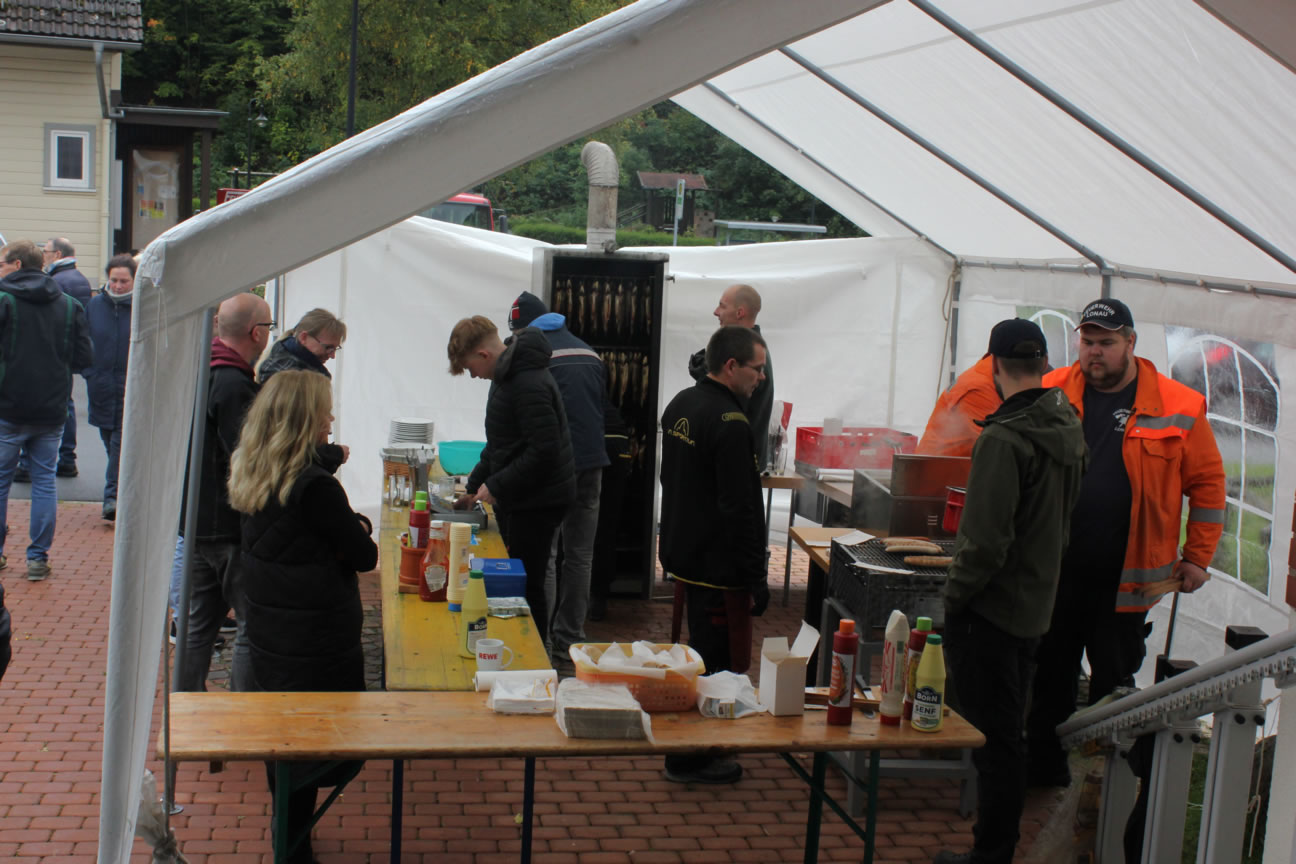 Ab 12:00 Uhr gab es frisch geräucherte Forellen direkt aus dem Smoker, wahlweise mit leckerem Kartoffelsalat, oder auch frisch gegrillte Bratwürste und Krakauer sowie leckere Pommes. Für das Grillen übernahm wie immer die Freiwillige Feuerwehr Lonau das Kommando. Hinter der Theke im DGH standen die freundlichen Helfer:innen der Bürgergemeinschaft und verkauften Bier, Kaffee und Kuchen.