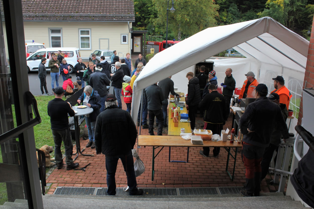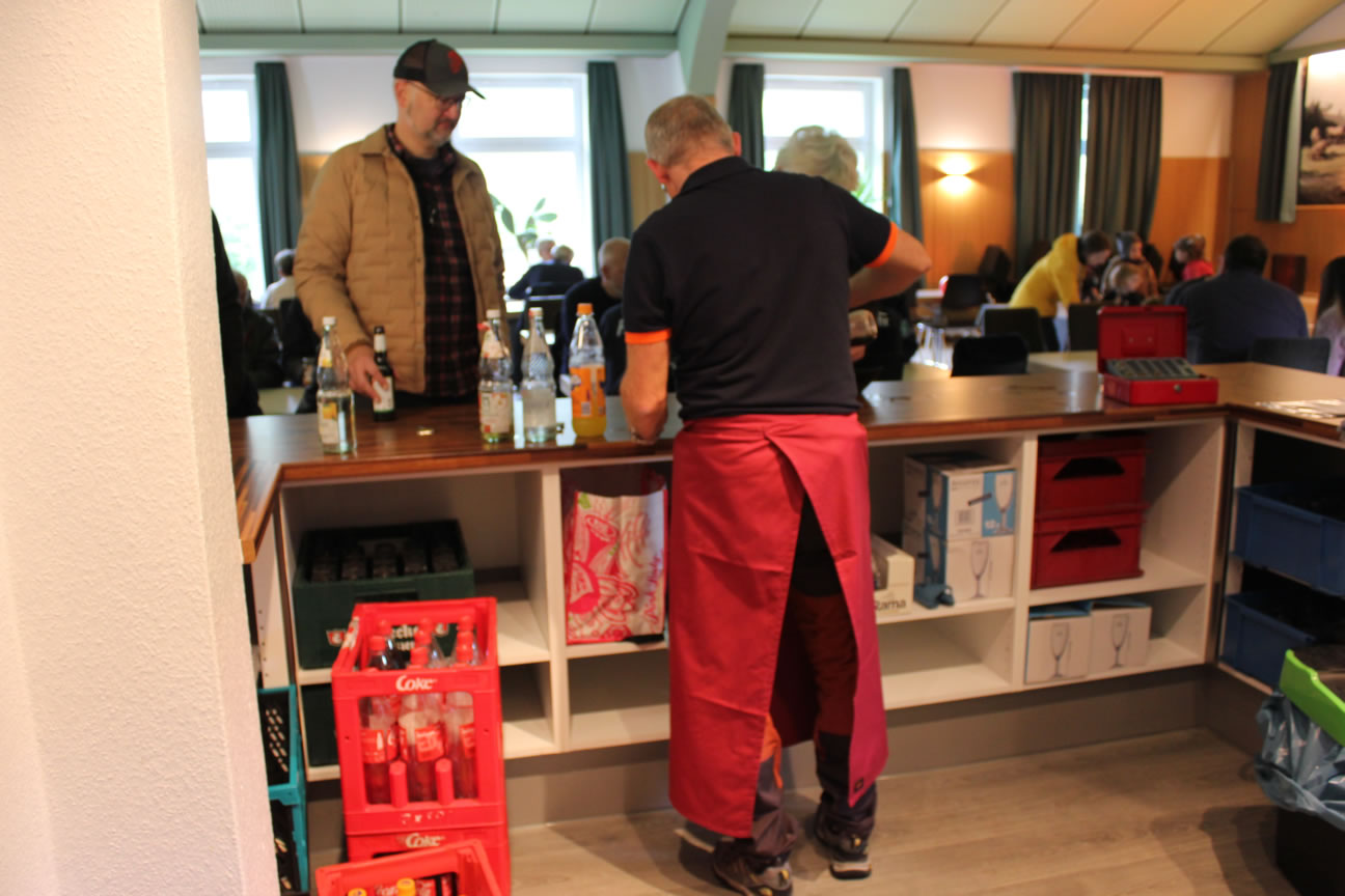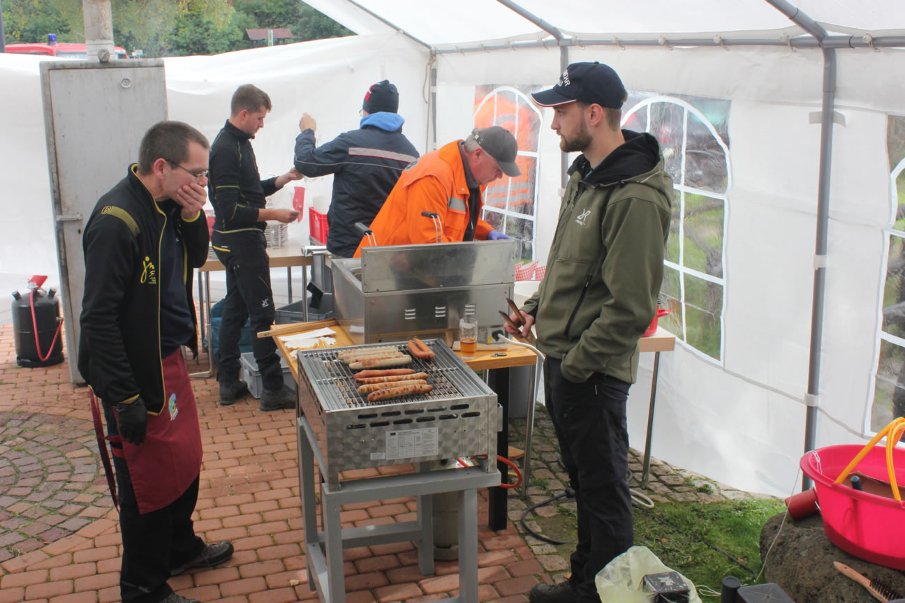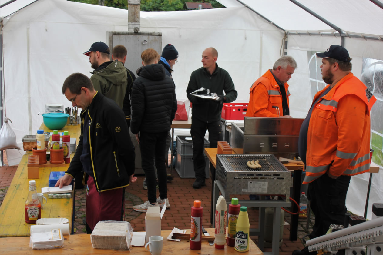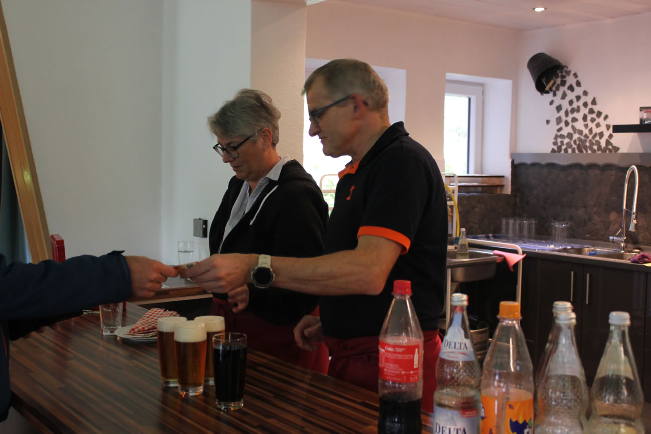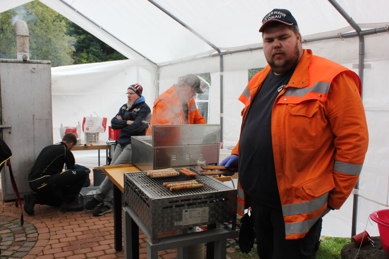 Ab 12:00 Uhr gab es frisch geräucherte Forellen direkt aus dem Smoker, wahlweise mit leckerem Kartoffelsalat, oder auch frisch gegrillte Bratwürste und Krakauer sowie leckere Pommes. Für das Grillen übernahm wie immer die Freiwillige Feuerwehr Lonau das Kommando. Hinter der Theke im DGH standen die freundlichen Helfer:innen der Bürgergemeinschaft und verkauften Bier, Kaffee und Kuchen.