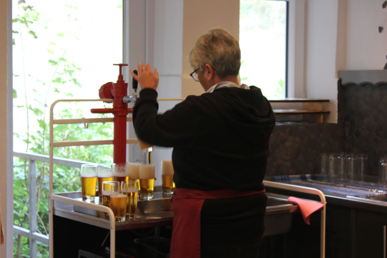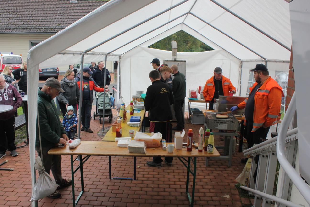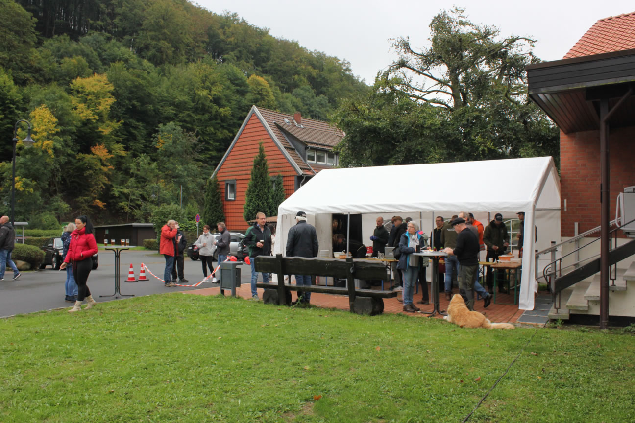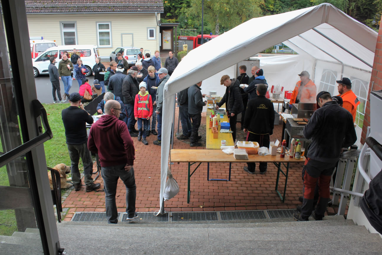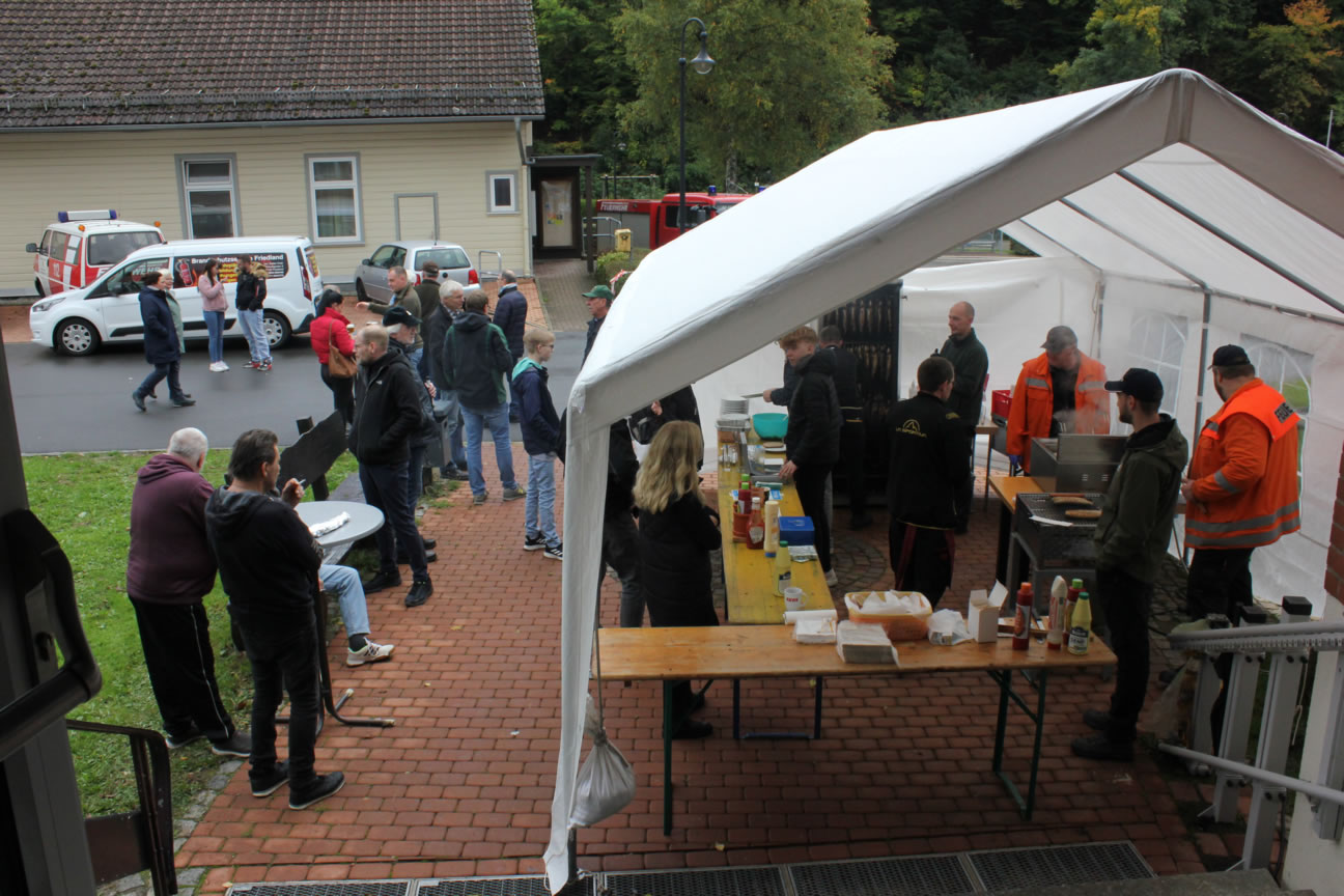 Ab 12:00 Uhr gab es frisch geräucherte Forellen direkt aus dem Smoker, wahlweise mit leckerem Kartoffelsalat, oder auch frisch gegrillte Bratwürste und Krakauer sowie leckere Pommes. Für das Grillen übernahm wie immer die Freiwillige Feuerwehr Lonau das Kommando. Hinter der Theke im DGH standen die freundlichen Helfer:innen der Bürgergemeinschaft und verkauften Bier, Kaffee und Kuchen.