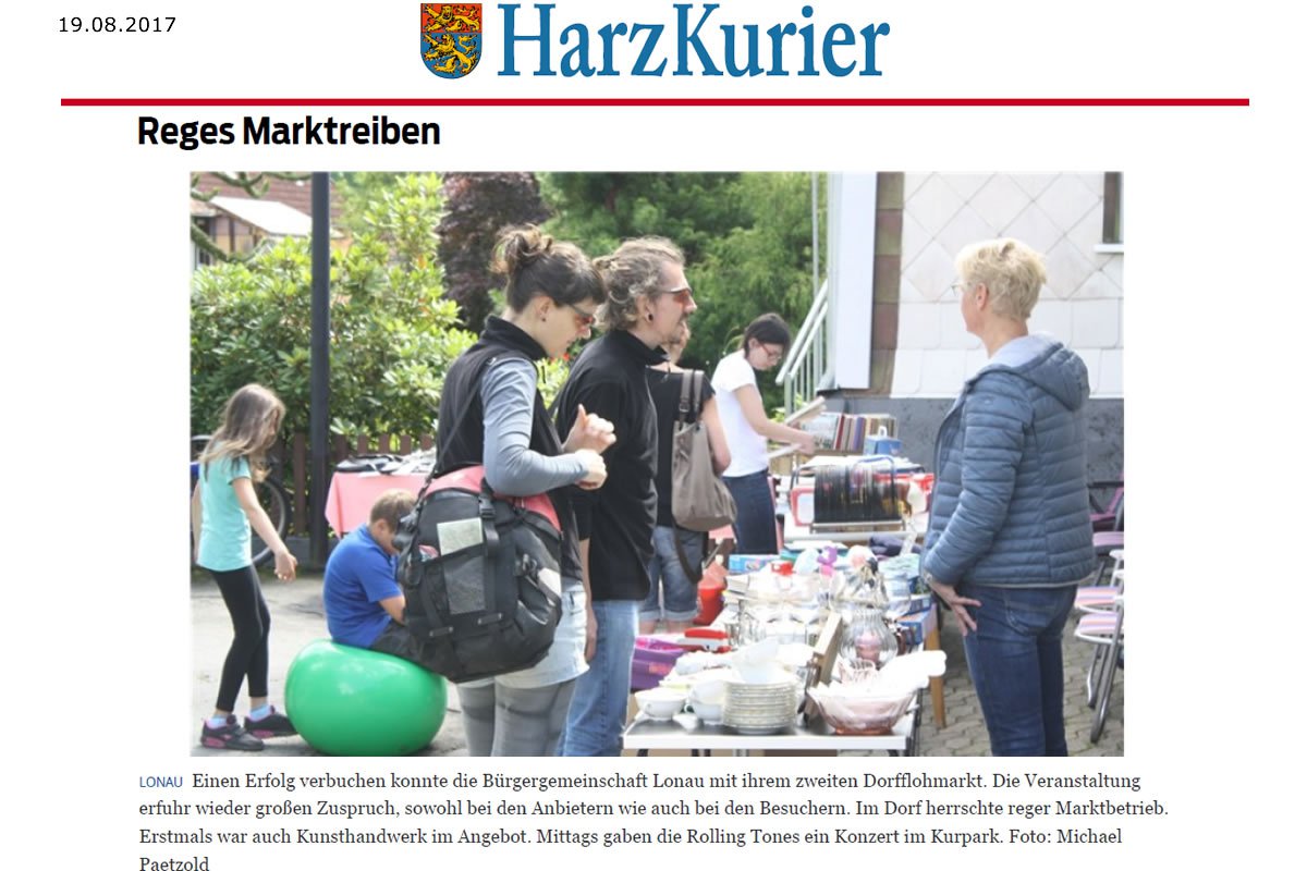 Der 2. Dorfflohmarkt, organisiert von der Lonauer Bürgergemeinschaft, war wieder ein voller Erfolg. Das Wetter spielte mit und so wurde Lonau zum Besuchermagneten für viele Gäste zum Schauen, Kaufen und Stöbern. Die Parkmöglichkeiten waren in allen Straßen erschöpft. Es gab viele Stände mit unterschiedlichen und vielfältigen Angeboten. Am Dorfgemeinschaftshaus wurde für das leibliche Wohl mit Kaffee und Kuchen, sowie Bratwurst und Getränken gesorgt. Alles fand reißenden Absatz. An dieser Stelle gilt allen Helfern ein großes Dankeschön! Im Kurpark wurden die Gäste mit Lifemusik von den „Rolling Tones“ unterhalten.