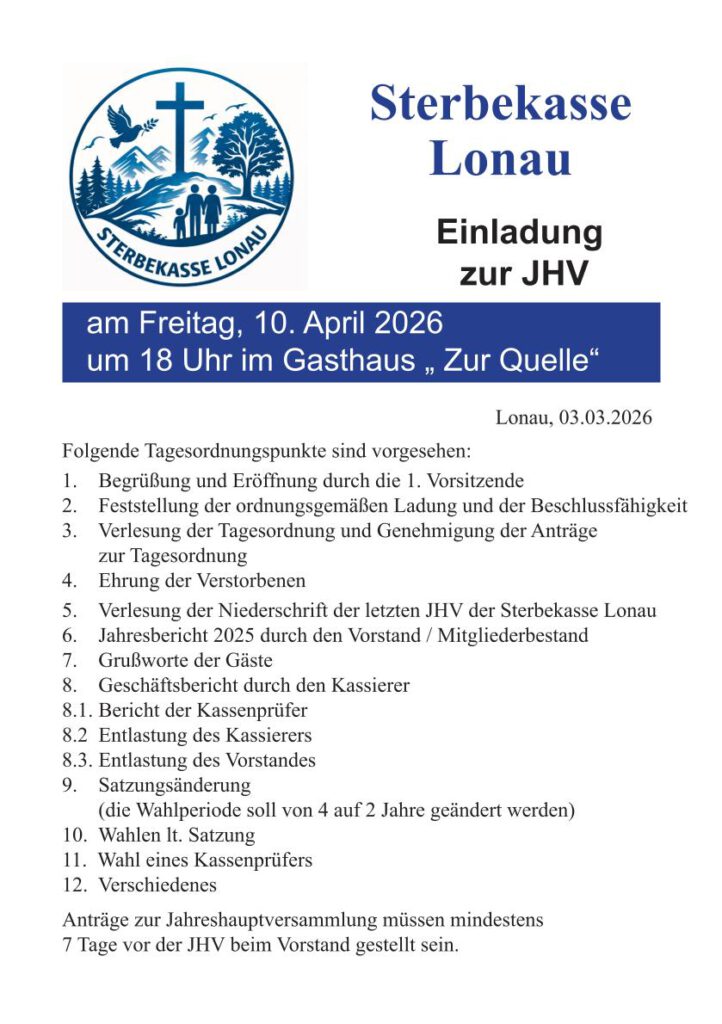 Die Sterbekasse Lonau lädt alle Mitglieder zur diesjährigen Jahreshauptversammlung ein. Die Versammlung findet am Freitag, 10. April 2026, um 18 Uhr im Gasthaus „Zur Quelle“ statt.
